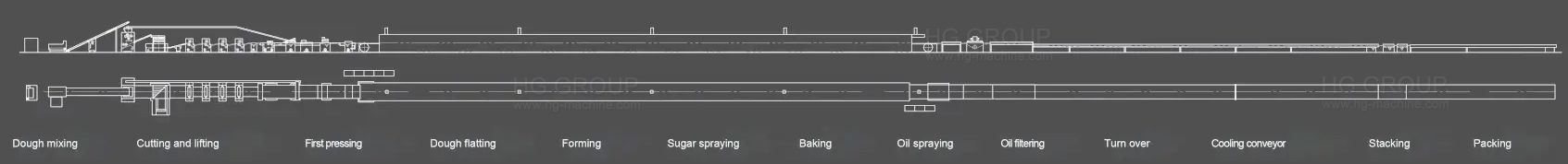 Повністю автоматична лінія виробництва печива - це нове покоління передового обладнання, яке може виробляти печиво, таке як м’яке печиво, тверде печиво, печиво з газованою водою та бутербродне печиво тощ Вона складається з тістомішалки, різальної машини, машини для ламінатора, формувальної машини, машина для розпилення цукру, тунельна піч, машина для розпилення олії, пакувальна машина тощо.