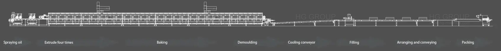 Основне обладнання: розпилювач масла, екструдер, піч для випічки, демолдинг, конвеєр, машина для наповнення та пакувальна машина.